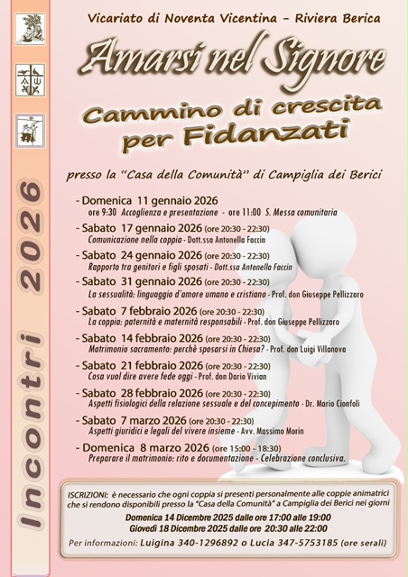 E’ il sacramento di chi si sente chiamato dal Signore al dono della propria vita nell’amore di coppia. Si propone la partecipazione al percorso per fidanzati, che si svolge tra marzo e gennaio a Campiglia.